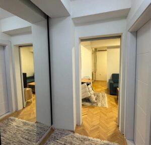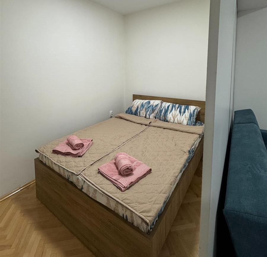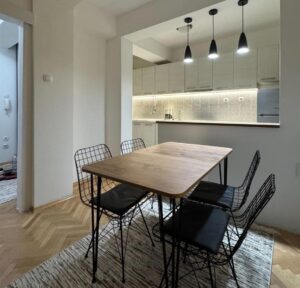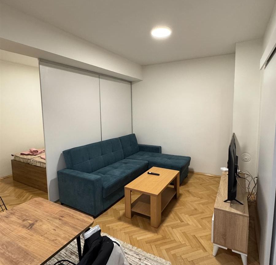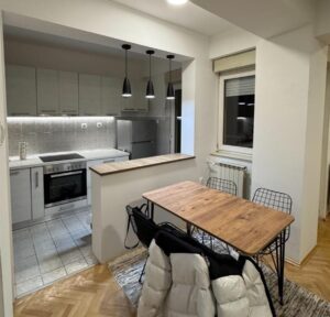 A fully renovated and furnished apartment with an area of 42m² is available for rent in the quiet and well-maintained building in Crnice, near Simpo. Renovated in 2024, the apartment is located on the 4th floor of a building with an elevator. It features a living room with dining area, functional kitchen, separated sleeping space, bathroom with shower cabin, and a terrace with southwest orientation. Central heating is provided, and the rental includes a dedicated parking space. The location is excellent, just 5–10 minutes on foot from the city center.