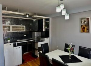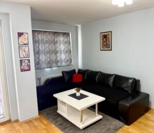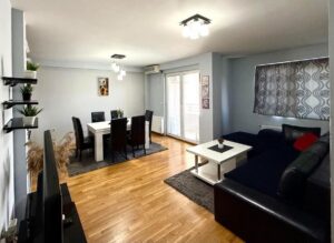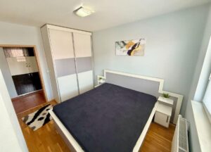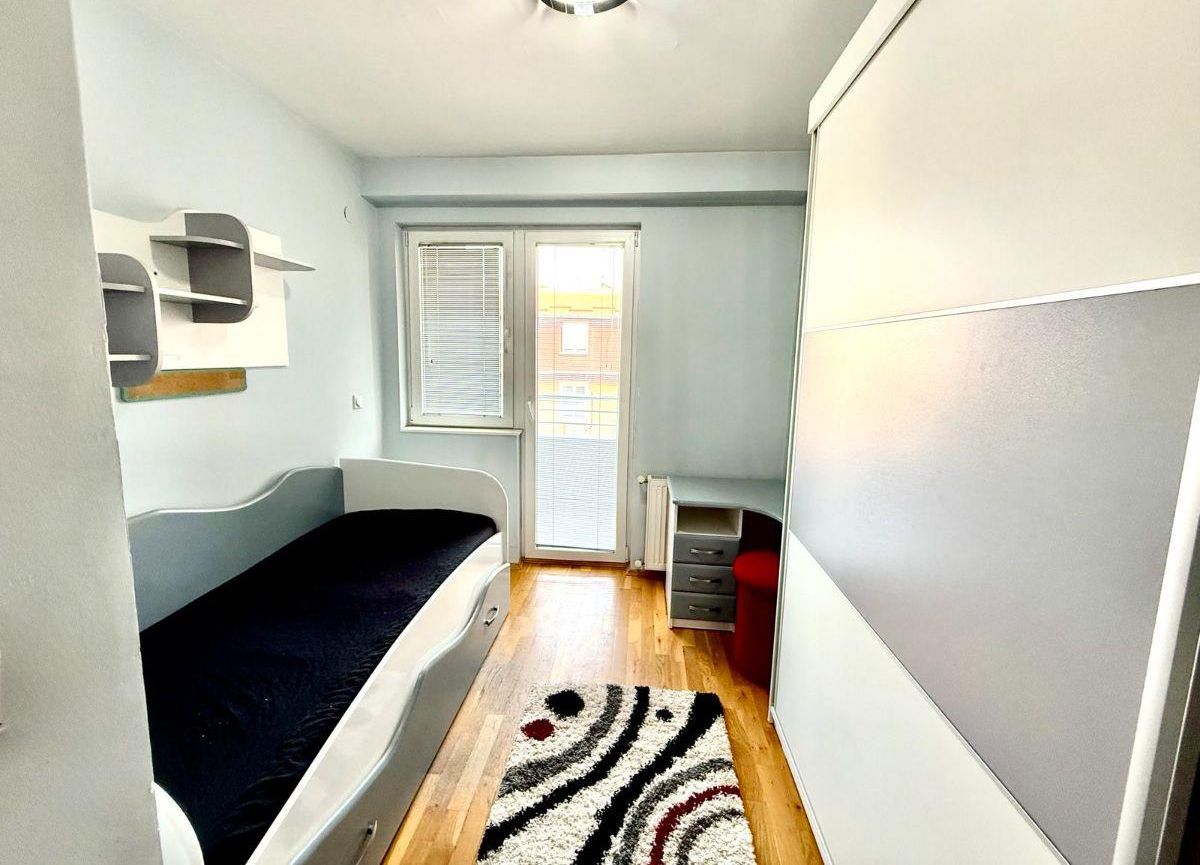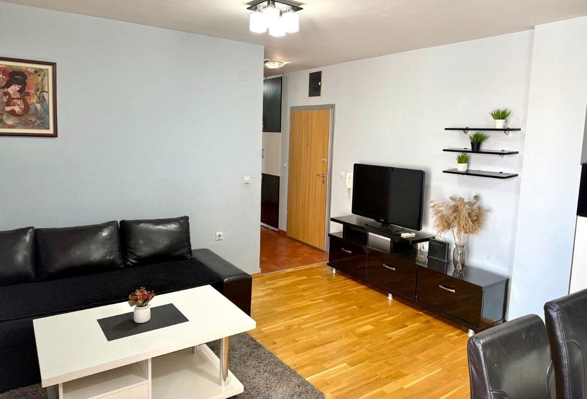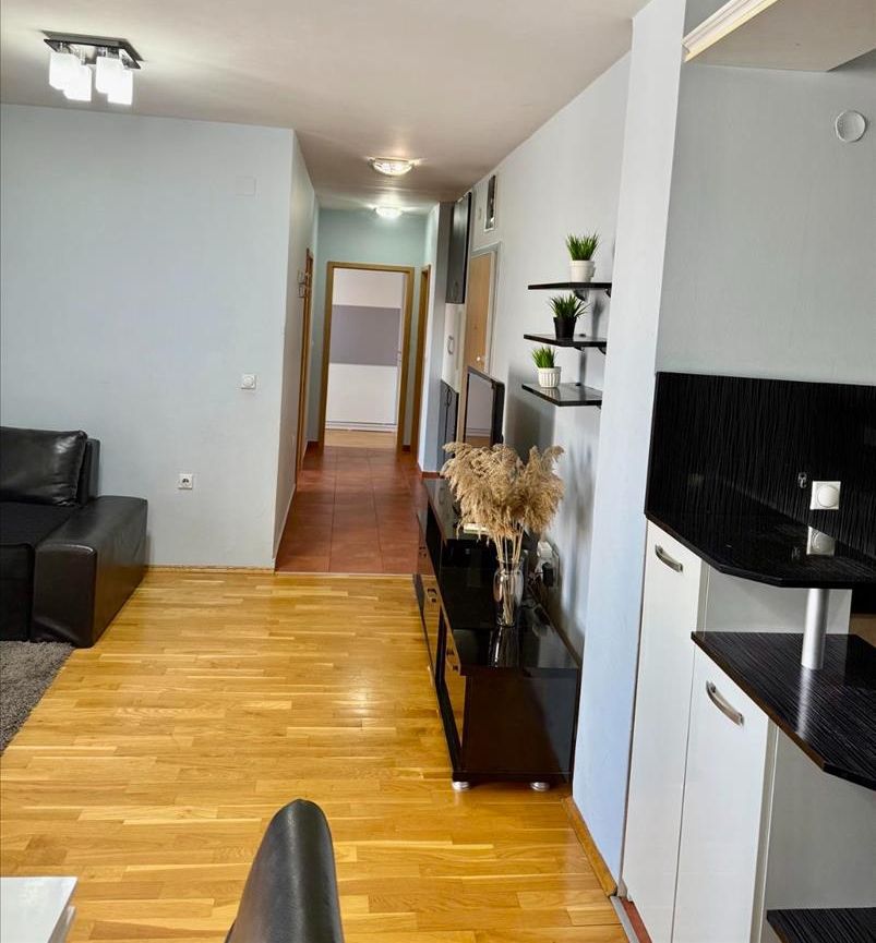 A well-furnished three-room apartment of 65m² is available for rent in Centar, near the Universal Hall and the bakery “Zlaten Klas.” Located on the 4th floor of a building with an elevator, the apartment features two bedrooms, a living room, kitchen, bathroom, and two balconies. It has central heating, east-facing orientation, and comes with a garage and a basement space. The building was constructed in 2012 and renovated in 2021. The location offers excellent access to public transport, shops, and city amenities.
