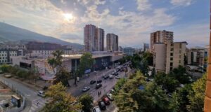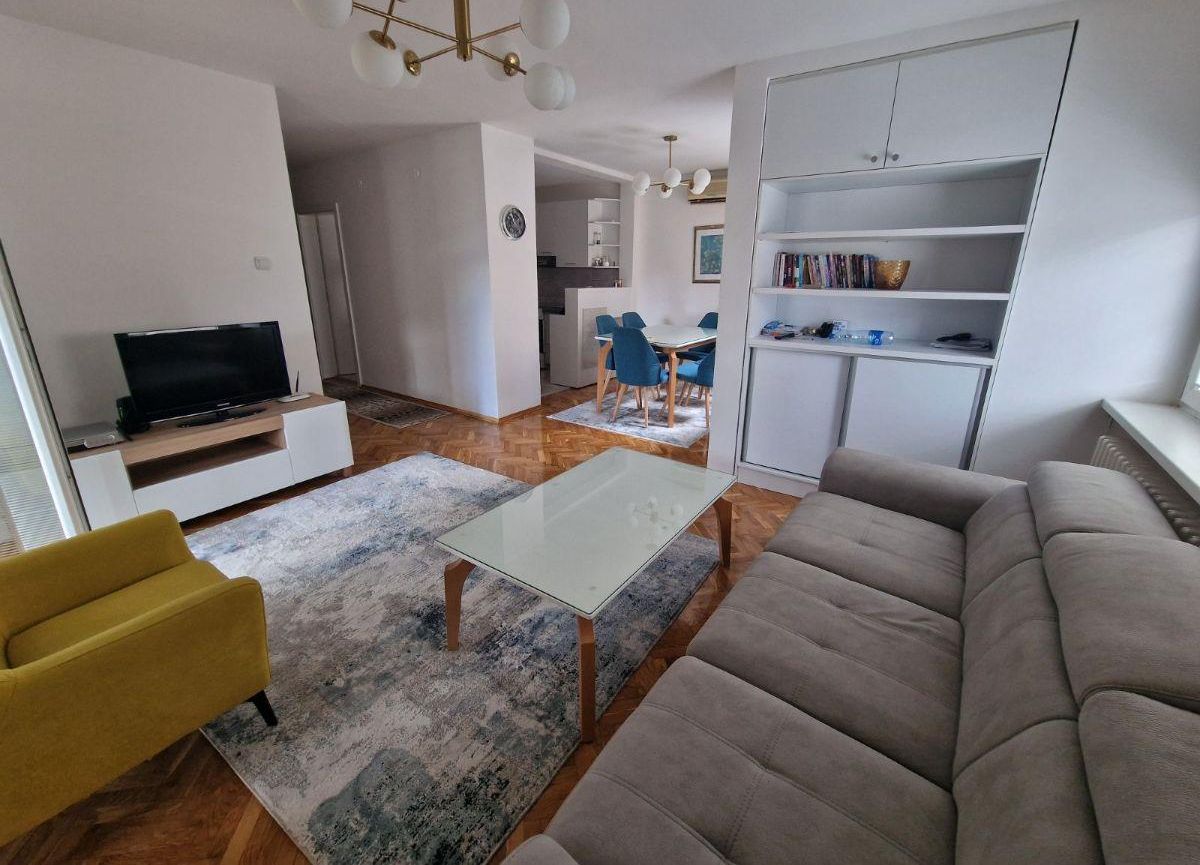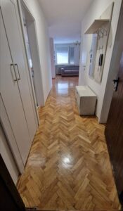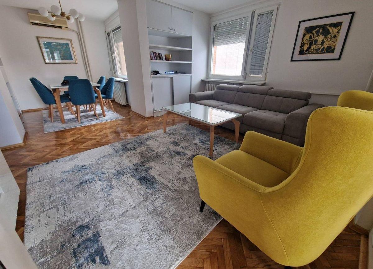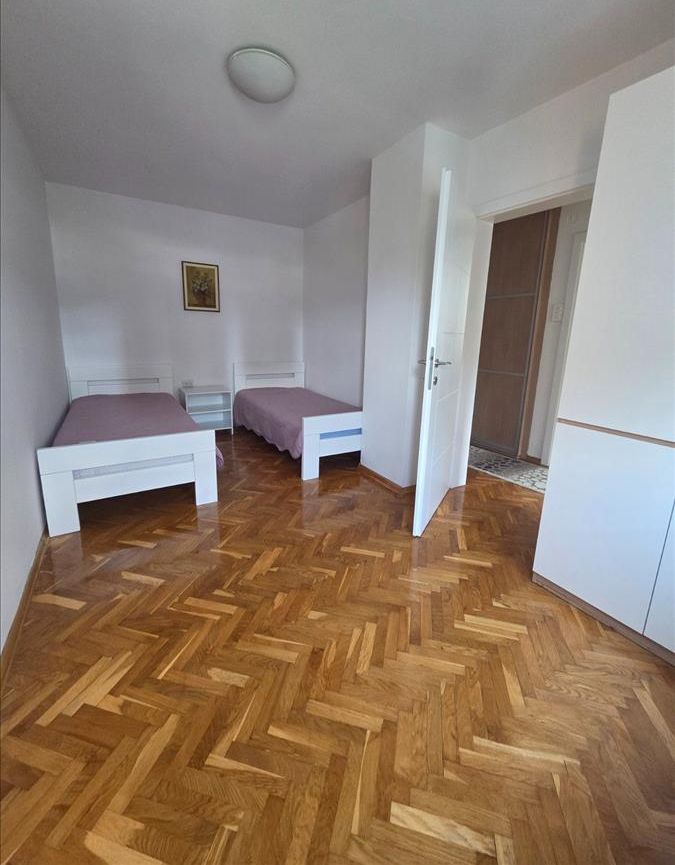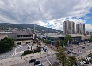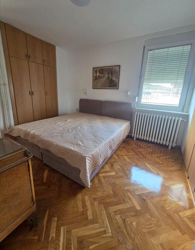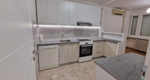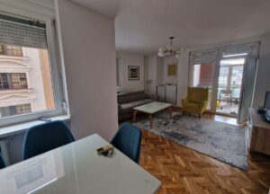 A fully renovated and modernly furnished 90m² apartment is available for rent on a prime location in Skopje’s city center, directly across from Ramstore Mall and Diamond Mall. Located on the 5th floor of a building with two elevators, it offers an open view toward Vodno and is just 200 meters from the main city square and public transport connections. The apartment includes two separate bedrooms accessed via a private hallway and a main bathroom, a spacious living and dining area with a fully equipped kitchen, an additional toilet, a storage room, and a large terrace. Central heating is provided, and there is the possibility of free parking for two vehicles on public parking in front of the building. Ideal for long-term living.