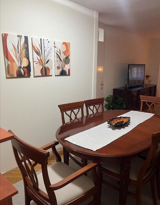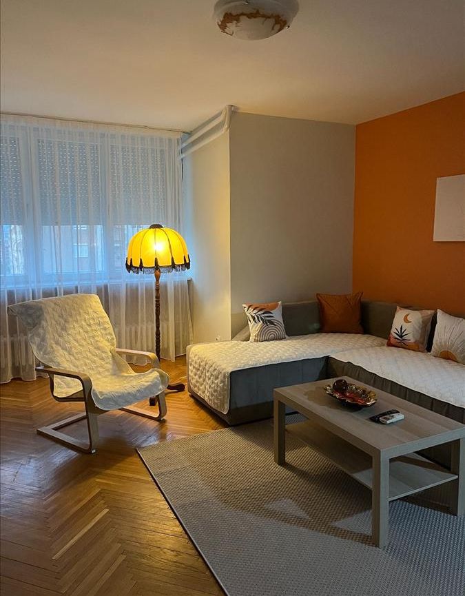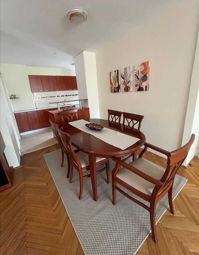 A spacious, fully furnished and renovated 90 m² apartment is available for rent on the seventh floor of a building with two elevators in Aerodrom, directly opposite the Equilibrium restaurant. The layout offers a living room with dining area and kitchen, two separate bedrooms, two bathrooms, a balcony facing northwest and an 8 m² storage room, while a designated parking space is included. Central heating, excellent access to the city centre and a well-maintained neighbourhood make this home an ideal choice for families or professionals seeking comfortable living in Skopje.