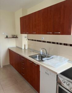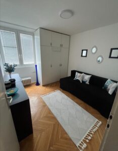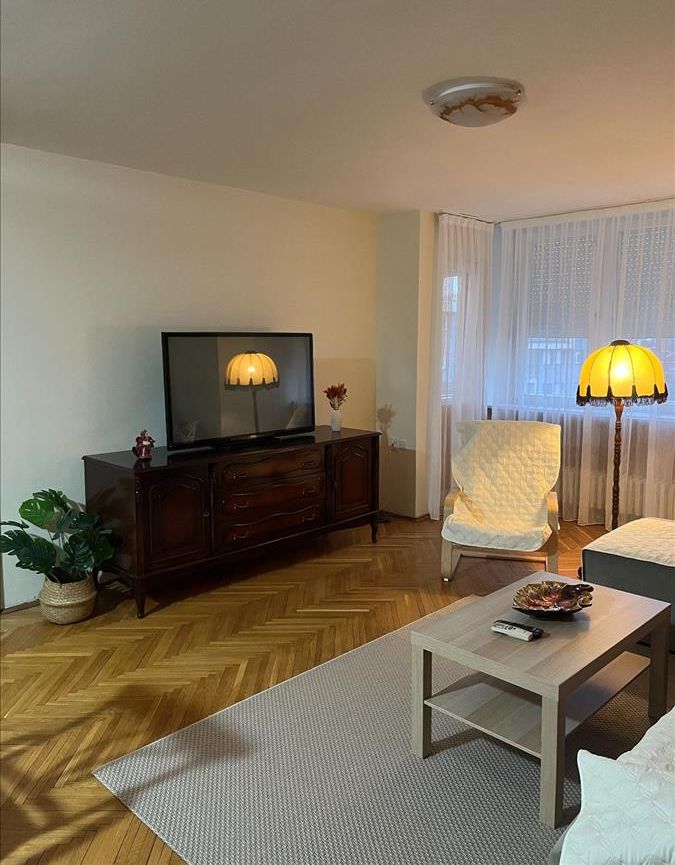 A spacious, fully furnished and renovated 90 m² apartment is available for rent on the seventh floor of a building with two elevators in Aerodrom, directly opposite the Equilibrium restaurant. The layout features a bright living-dining area with kitchen, two separate bedrooms, two bathrooms, a balcony facing northwest and an 8 m² storage room, while a dedicated parking space is included. Central heating, excellent public-transport links and quick access to major thoroughfares ensure comfortable everyday living, making this home an ideal choice for families or professionals.