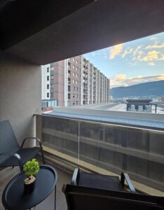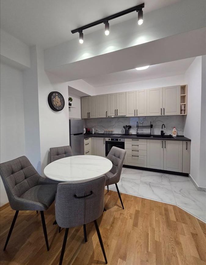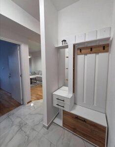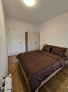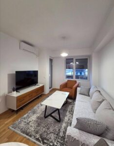 Се издава целосно нов, модерно наместен стан во мирна и атрактивна локација во комплекс „Порта Супериум“. Станот е подготвен за прво вселување и нуди функционален распоред со дневен престој и кујна, спална соба, бања и балкон. Обезбедено е паркинг место, а за комфор во текот на целата година станот располага со централно градско парно и инвертер клима. Локацијата овозможува брз пристап до Центар (околу 10 минути) и е на неколку минути од Железничка станица, со маркети, аптеки и други содржини во близина.