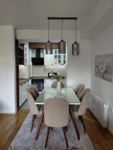 Се издава целосно опремен стан со површина од 72 м², лоциран во современа зграда на мирна и урбана локација во Тафталиџе 1, во непосредна близина на гимназијата НОВА. Станот се наоѓа на втор кат со источна ориентација и располага со две спални соби, бања и дополнителен гостински тоалет. Опремен е со нов и модерен мебел, има парно греење, клима уред и се издава со подземен паркинг. Во близина има градинки, основни и средни училишта, како и маркети. Станот е веднаш вселив, што претставува дополнителна предност за идните станари.